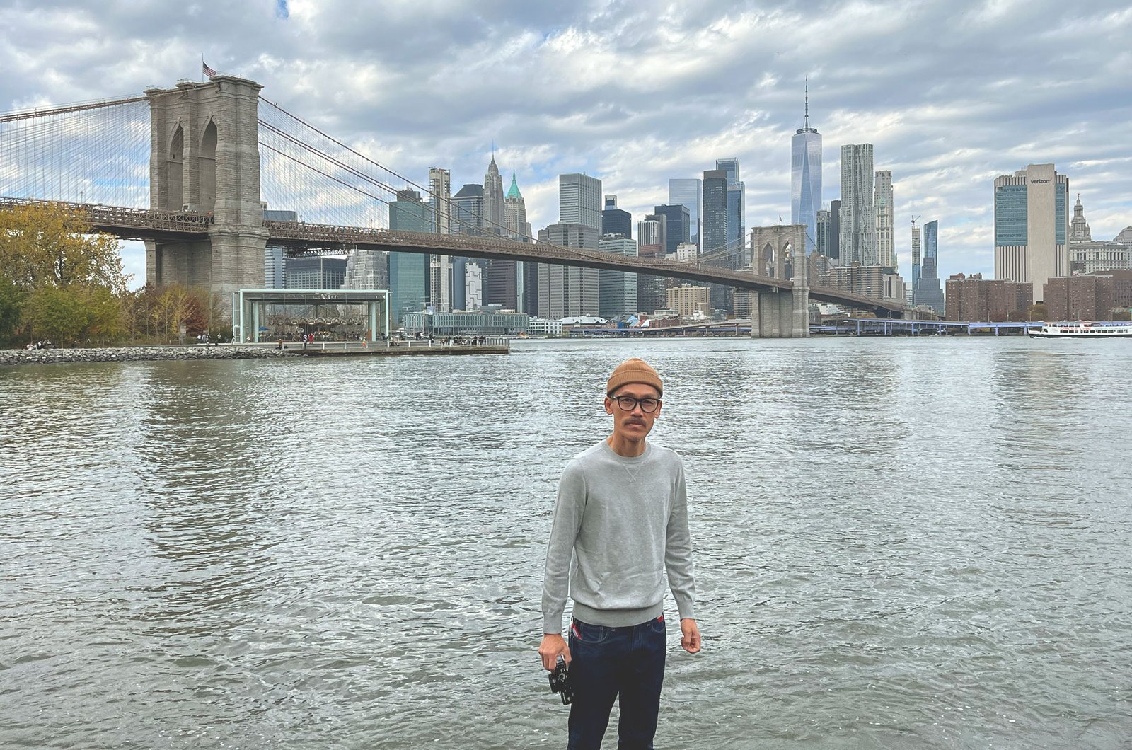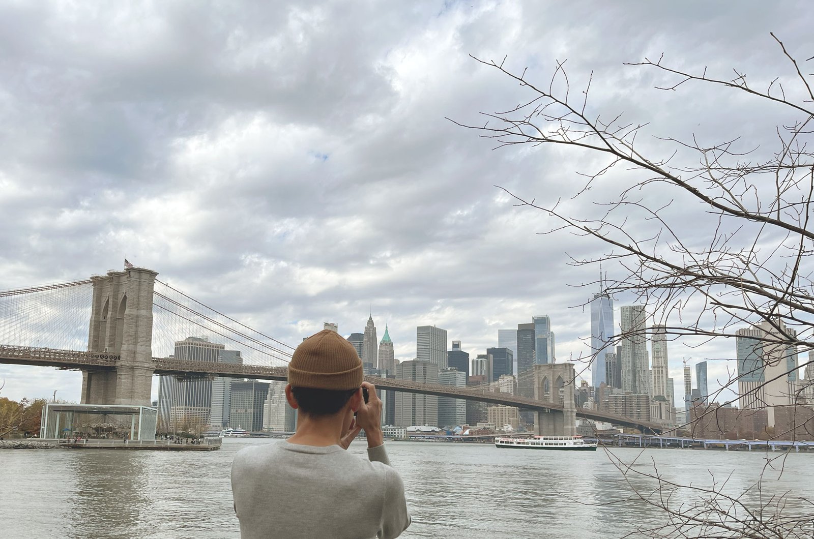 Framing a shot of the Brooklyn Bridge and Lower Manhattan